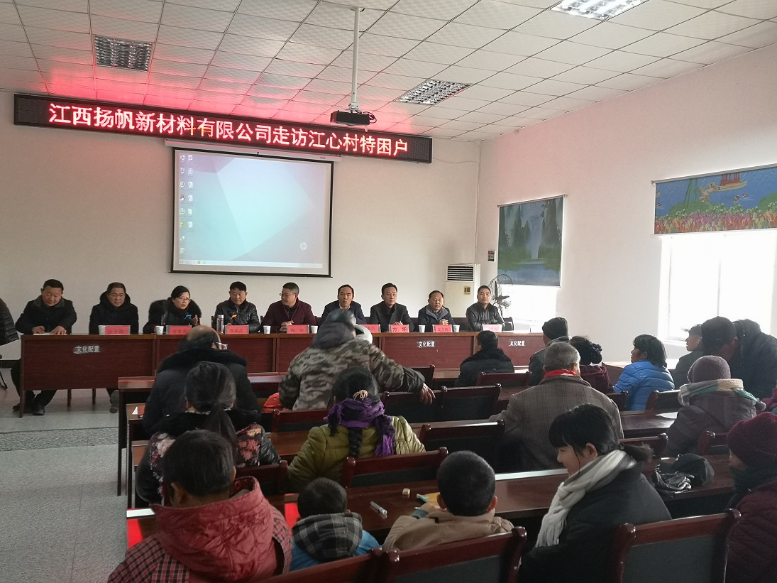2019年1月20日,正值春節來臨之際,浙江揚帆新材料股份有限公司副總裁陶明,江西揚帆新材料有限公司總經理陳育亮在彭澤縣政府扶貧辦副主任許金花,縣工商聯主任吳義群,縣質監局局長慈金兵,縣就業局副局長汪子正等領導的陪同下來到棉船鎮江心村,開展“產業幫扶及走訪、慰問特困黨員、貧困戶”活動。