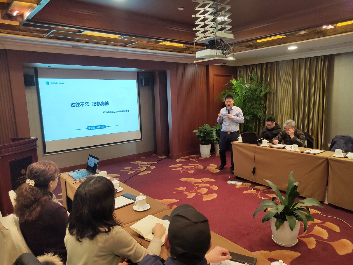 2019年1月26日,揚(yáng)帆新材年度高管會(huì)議在杭州召開,公司控股股東浙江揚(yáng)帆控股集團(tuán)有限公司董事長(zhǎng)樊培仁,揚(yáng)帆新材董事長(zhǎng)樊彬,總裁李耀土,副總裁朱俊飛、陶明、劉輝,財(cái)務(wù)總監(jiān)上官云明,技術(shù)總監(jiān)吳紅輝,董事會(huì)秘書樊相東以及各子公司高管悉數(shù)出席并作年度工作報(bào)告。