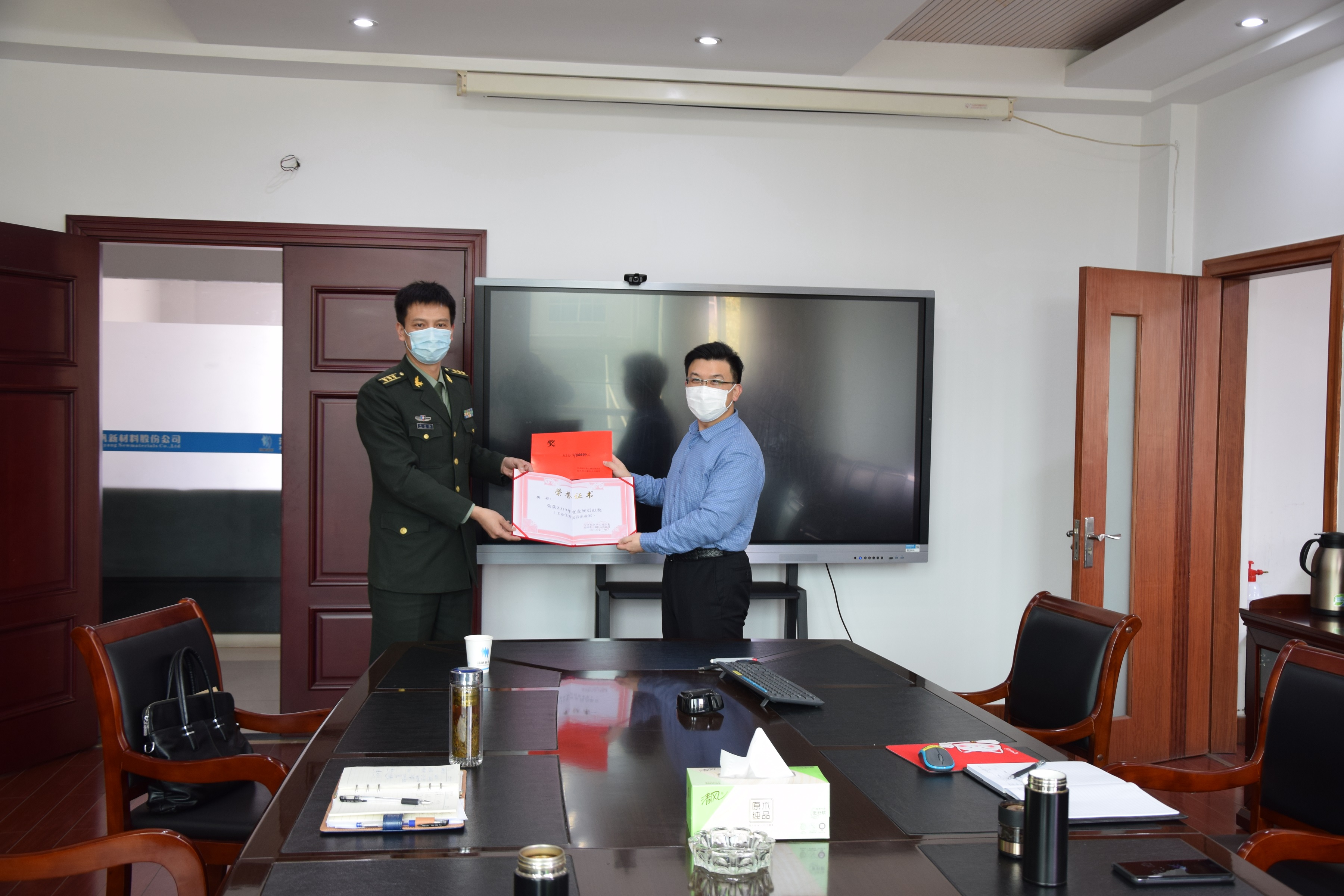 3月11日下午,上虞區(qū)委常委、區(qū)人武部政委項(xiàng)延玳一行蒞臨揚(yáng)帆新材調(diào)研企業(yè)防疫工作,并為揚(yáng)帆新材董事長樊彬頒發(fā)上虞區(qū)2019年度發(fā)展貢獻(xiàn)獎(jiǎng)。揚(yáng)帆新材總裁李耀土、董事會(huì)秘書樊相東等陪同并匯報(bào)工作。